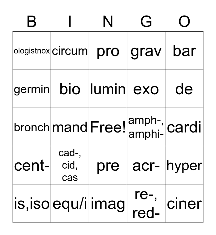 This bingo card has a free space and 30 words: equ/i, inter, mand, ology, ologistnox, pro, bio, pre, amph-, amphi-, imag, cardi, ciner, re-, red-, ab-,a-,abs-, de, carbo, acr-, cent-, cad-, cid, cas, bar, bronch, dens, circum, exo, germin, grav, hyper, is,iso, lumin and patr.