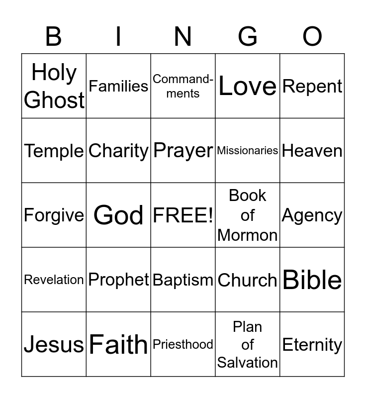 This bingo card has a free space and 24 words: Prophet, Faith, Prayer, Jesus, Repent, Holy Ghost, Temple, Families, Book of Mormon, Baptism, Missionaries, Forgive, Church, Bible, Charity, Plan of Salvation, Agency, Command- ments, Heaven, God, Eternity, Revelation, Love and Priesthood.