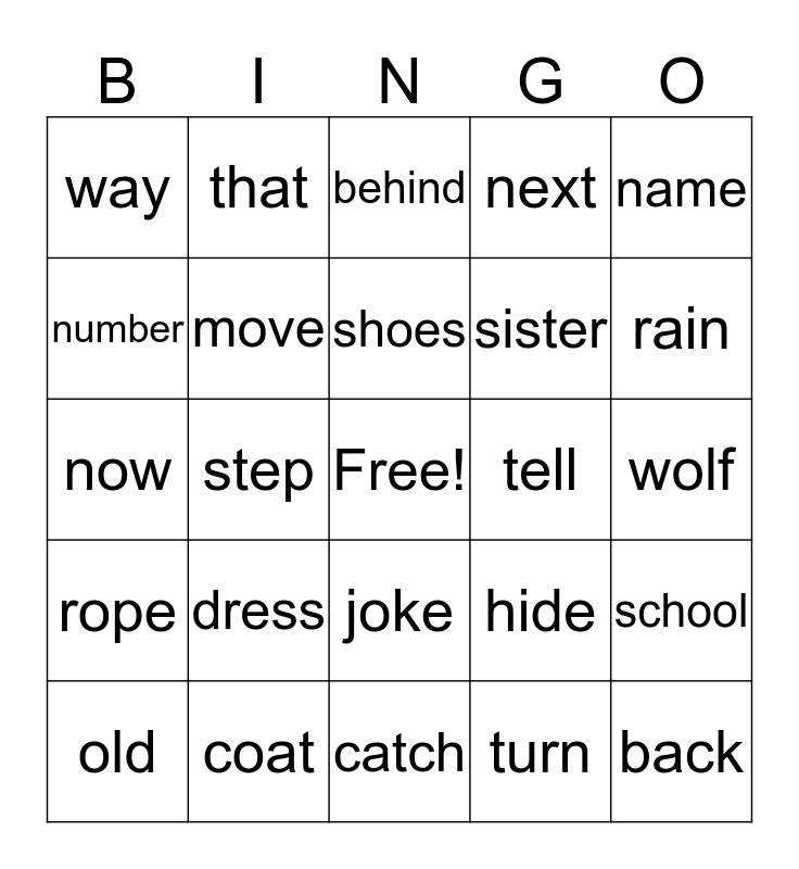 This bingo card has a free space and 24 words: dress, coat, shoes, old, name, way, number, that, tell, joke, sister, now, hide, school, move, turn, wolf, behind, rain, step, back, rope, next and catch.