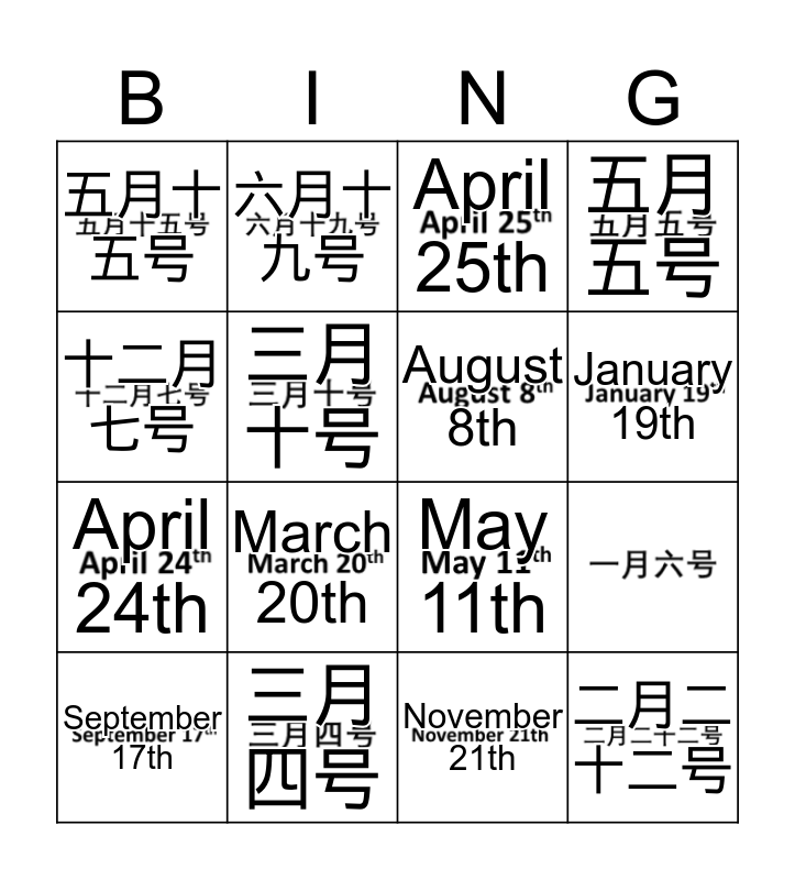This bingo card has 28 images and 26 words: 二月八号, 五月十五号, April 25th, August 8th, 八月十二号, 三月四号, 九月十八号, November 21th, September 17th, 五月十八号, 十月二十号, March 20th, February 28th, October 10th, 二月二十二号, 十二月七号, May 11th, 七月四号, 十一月九号, April 24th, 三月十号, 五月五号, 六月十九号, December 12th, January 19th and May 15th.