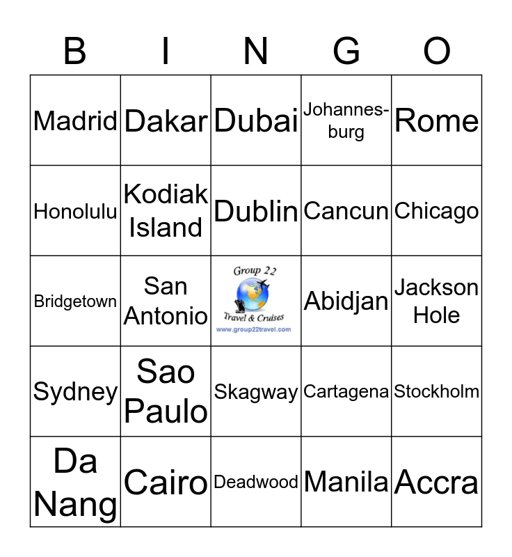 This bingo card has a free space and 44 words: St. Augustine, Sao Paulo, Shanghai, Manila, Melbourne, Moscow, Kodiak Island, Zurich, Johannes-burg, Accra, Madrid, Cairo, Cartagena, Jackson Hole, Havana, Negril, Deadwood, Abidjan, Oranjestad, Bridgetown, Dakar, Skagway, Playa del Carmen, Rome, London, Montreal, Dublin, Frankfurt, Stockholm, Da Nang, Glasgow, Dubai, Reykjavik, Sao Paulo, Sydney, Jakarta, Mecca, Atlanta, Chicago, Honolulu, San Antonio, Edmonton, Cancun and Las Vegas.