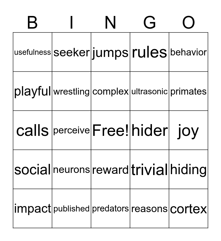 This bingo card has a free space and 24 words: neurons, published, complex, impact, behavior, usefulness, playful, seeker, hider, reward, ultrasonic, calls, trivial, hiding, wrestling, reasons, joy, jumps, primates, perceive, cortex, social, rules and predators.