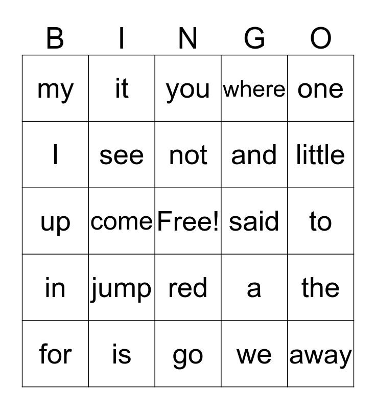 This bingo card has a free space and 28 words: the, blue, and, we, I, you, it, in, said, for, up, where, is, go, little, down, jump, see, not, red, my, me, away, come, to, a, one and big.