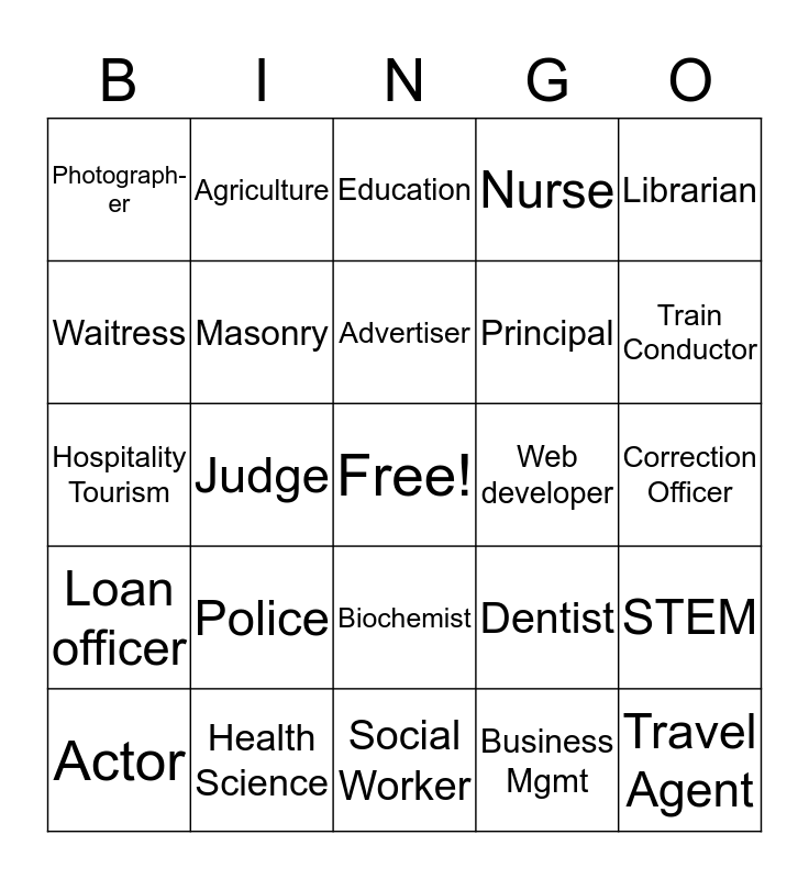 This bingo card has 5 images, a free space and 34 words: Farming, Power Plant, Airplane Pilot, Masonry, Actor, Biochemist, Advertiser, Office Mgr, Librarian, Loan officer, Judge, Nurse, Travel Agent, Correction Officer, Web developer, Police, Factory worker, Photograph-er, Vet, Dentist, Waitress, Social Worker, Principal, Train Conductor, Agriculture, Human Services, Energy, Education, Health Science, Business Mgmt, Information Technology, STEM, Hospitality Tourism and Finance.