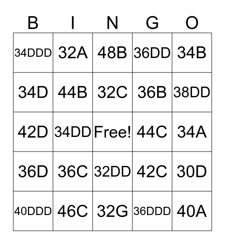 This bingo card has a free space and 67 words: 30A, 30B, 30C, 30D, 30DD, 30DDD, 32A, 32B, 32C, 32D, 32DD, 32DDD, 34A, 34B, 34C, 34D, 34DD, 34DDD, 36A, 36B, 36C, 36D, 36DD, 36DDD, 38A, 38B, 38C, 38D, 38DD, 38DDD, 40A, 40B, 40C, 40D, 40DD, 40DDD, 42B, 42C, 42D, 42DD, 42DDD, 44B, 44C, 44D, 44DD, 44DDD, 46B, 46C, 46D, 46DD, 48B, 48C, 48D, 34AA, 30G, 32G, 32H, 34G, 34H, 36G, 36H, 38G, 38H, 40G, 40H, 42G and 42H.