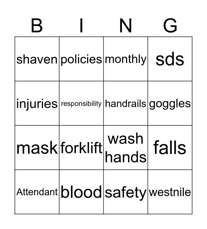 This bingo card has 21 words: Attendant, coffee, handrails, boots, hardhat, policies, monthly, sds, injuries, responsibility, westnile, shaven, blood, safety, falls, respirator, forklift, wash hands, goggles, mask and idoc.