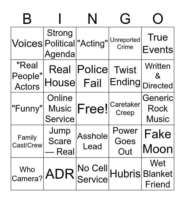 This bingo card has a free space and 24 words: Jump Scare — Real, ADR, Police Fail, Who Camera?, True Events, Voices, "Real People" Actors, Strong Political Agenda, Caretaker Creep, Asshole Lead, Twist Ending, "Funny", Power Goes Out, Fake Moon, Real House, Hubris, Generic Rock Music, "Acting", Written & Directed, Online Music Service, Wet Blanket Friend, Family Cast/Crew, Unreported Crime and No Cell Service.