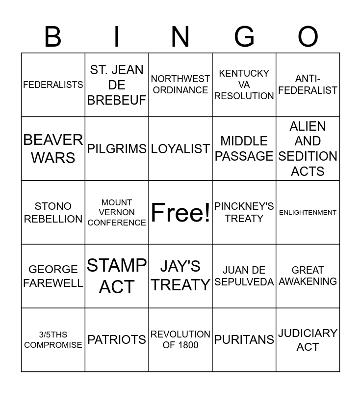 This bingo card has a free space and 24 words: STAMP ACT, PATRIOTS, LOYALIST, 3/5THS COMPROMISE, ANTI-FEDERALIST, FEDERALISTS, BEAVER WARS, ST. JEAN DE BREBEUF, PINCKNEY'S TREATY, JAY'S TREATY, MIDDLE PASSAGE, STONO REBELLION, JUAN DE SEPULVEDA, GREAT AWAKENING, PILGRIMS, PURITANS, ENLIGHTENMENT, NORTHWEST ORDINANCE, ALIEN AND SEDITION ACTS, MOUNT VERNON CONFERENCE, JUDICIARY ACT, GEORGE FAREWELL, KENTUCKY VA RESOLUTION and REVOLUTION OF 1800.
