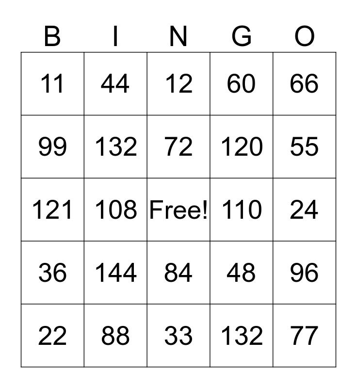 This bingo card has a free space and 24 words: 22, 144, 72, 132, 66, 11, 44, 12, 110, 24, 121, 132, 48, 96, 99, 88, 33, 60, 55, 36, 108, 84, 120 and 77.