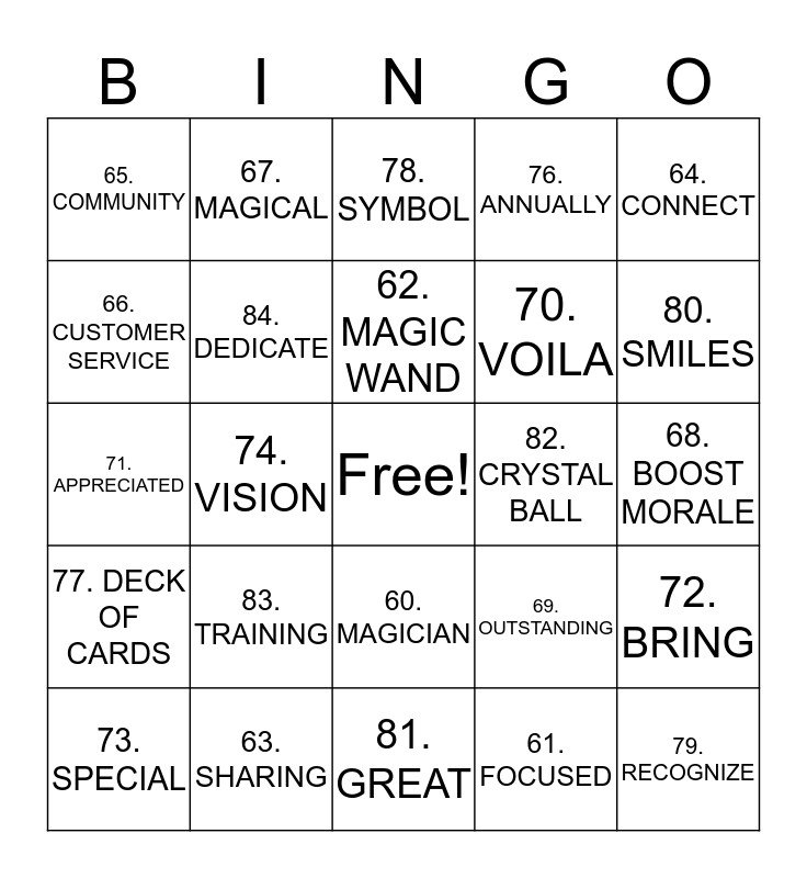 This bingo card has a free space and 26 words: 60. MAGICIAN, 61. FOCUSED, 62. MAGIC WAND, 63. SHARING, 64. CONNECT, 65. COMMUNITY, 66. CUSTOMER SERVICE, 67. MAGICAL, 68. BOOST MORALE, 69. OUTSTANDING, 70. VOILA, 71. APPRECIATED, 72. BRING, 73. SPECIAL, 74. VISION, 75. PROFESSIONAL, 76. ANNUALLY, 77. DECK OF CARDS, 78. SYMBOL, 79. RECOGNIZE, 80. SMILES, 81. GREAT, 82. CRYSTAL BALL, 83. TRAINING, 84. DEDICATE and 85. STRONGER.