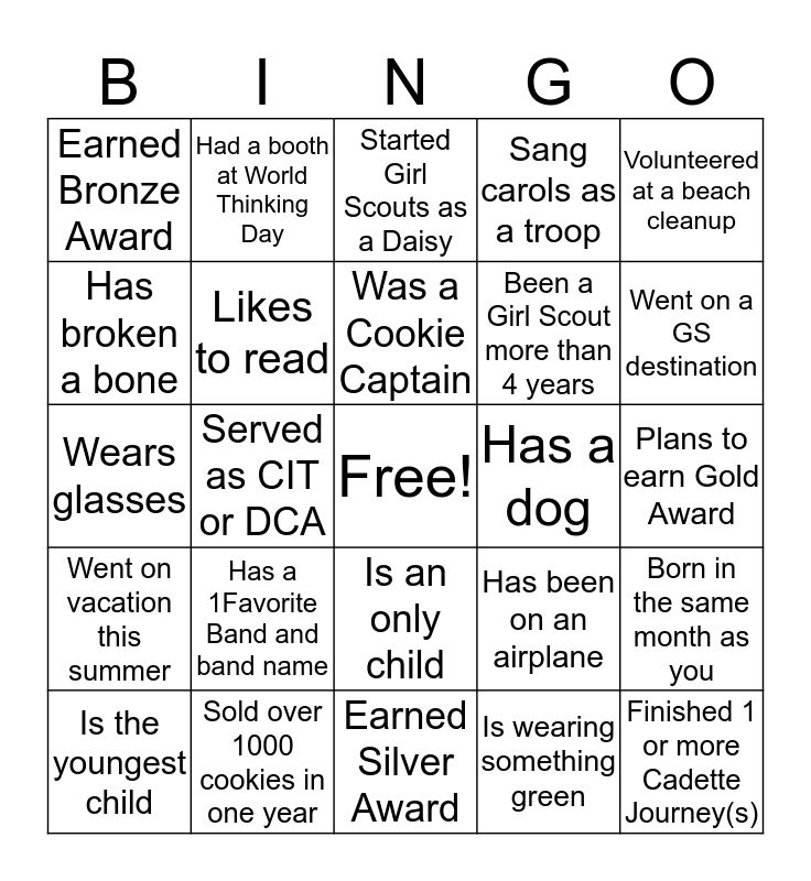 This bingo card has a free space and 24 words: Has a 1Favorite Band and band name, Sold over 1000 cookies in one year, Was a Cookie Captain, Is the youngest child, Volunteered at a beach cleanup, Earned Bronze Award, Has broken a bone, Had a booth at World Thinking Day, Has a dog, Is an only child, Been a Girl Scout more than 4 years, Wears glasses, Has been on an airplane, Born in the same month as you, Likes to read, Is wearing something green, Plans to earn Gold Award, Started Girl Scouts as a Daisy, Went on a GS destination, Served as CIT or DCA, Finished 1 or more Cadette Journey(s), Went on vacation this summer, Sang carols as a troop and Earned Silver Award.