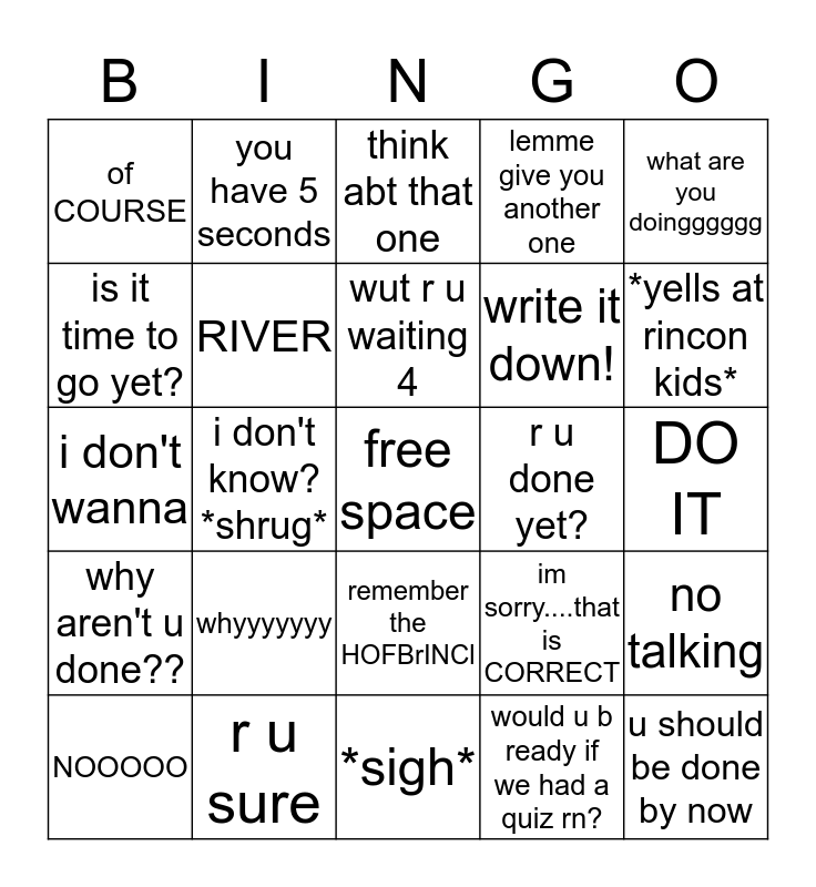 This bingo card has a free space and 24 words: whyyyyyyy, r u sure, wut r u waiting 4, NOOOOO, what are you doingggggg, of COURSE, is it time to go yet?, you have 5 seconds, r u done yet?, remember the HOFBrINCl, write it down!, i don't wanna, im sorry....that is CORRECT, no talking, RIVER, would u b ready if we had a quiz rn?, DO IT, think abt that one, *yells at rincon kids*, i don't know? *shrug*, u should be done by now, why aren't u done??, lemme give you another one and *sigh*.