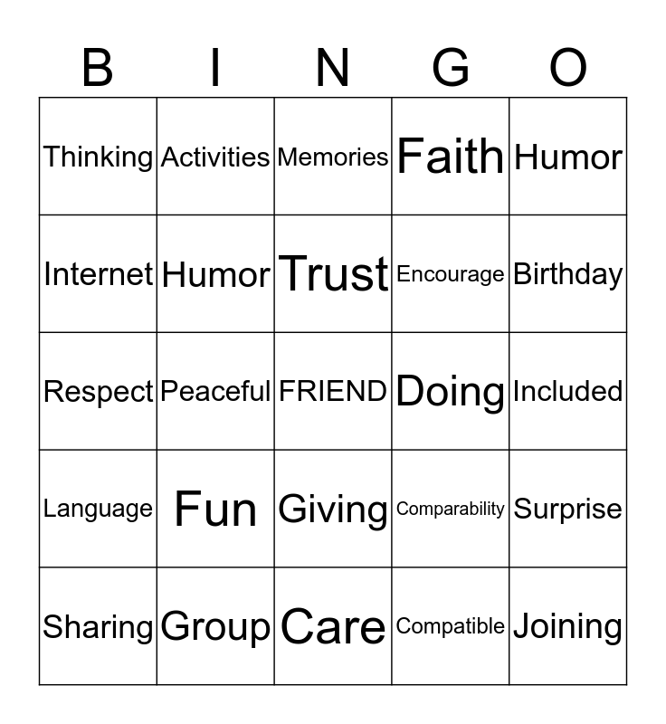 This bingo card has a free space and 94 words: Friends, Kindness, Care, Help, Uplifting, Respect, Faith, Sharing, Positive, Secrets, Outings, Differences, Activities, Encourage, Love, Humor, Memories, Trust, Parties, Singing, Honesty, Talking, Fun, Group, Fun, Humor, Memories, Healthy, Alone, Invite, Group, Giving, Golden, Rule, Activities, Sports, Crafts, Confidentiality, Trust, Comparability, Respect, Language, Included, Leader, Joining, Love, Like, Right, Wrong, Rumors, Sweet, Compatible, Party, Selfish, Anger, Singing, Higher, Power, Healing, Calm, Peaceful, Help, School, Heart, Games, Reading, Movies, Sorry, Internet, Talking, Food, Art, Success, Responsible, Faith, Examples, Words, Birthday, Surprise, Ideas, Great, Writing, News, Doing, Thinking, Goals, Reputation, Excellence, Minds, Work, Admire, Crying, Sadness and Money.