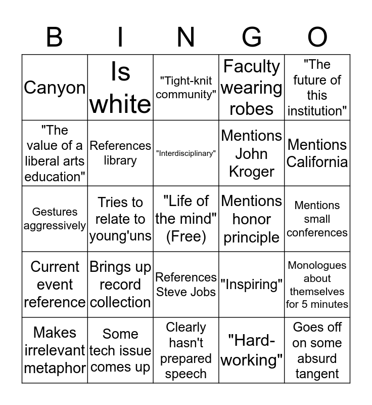 This bingo card has a free space and 24 words: Brings up record collection, Some tech issue comes up, "Interdisciplinary", Makes irrelevant metaphor, "The future of this institution", Canyon, "The value of a liberal arts education", Is white, Mentions honor principle, References Steve Jobs, Mentions John Kroger, Gestures aggressively, "Inspiring", Monologues about themselves for 5 minutes, References library, "Hard-working", Mentions small conferences, "Tight-knit community", Mentions California, Tries to relate to young'uns, Goes off on some absurd tangent, Current event reference, Faculty wearing robes and Clearly hasn't prepared speech.