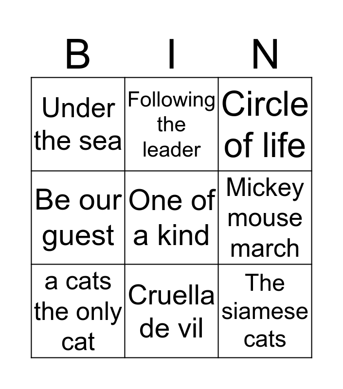This bingo card has a free space and 16 words: One jump ahead, A very unbirthday, Circle of life, Under the sea, Once upon a dream, Following the leader, YO HO, Hakuna matata, The siamese cats, Mickey mouse march, wonderful things about tiger, Be our guest, Heigh-ho, Cruella de vil, a cats the only cat and cant wait to be king.