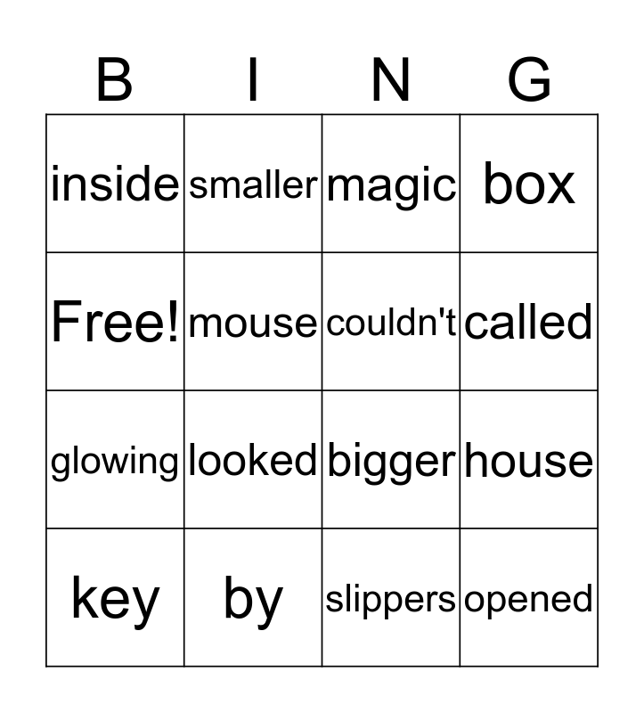 This bingo card has 16 words: by, house, magic, inside, glowing, smaller, bigger, slippers, Free!, mouse, key, box, looked, called, couldn't and opened.