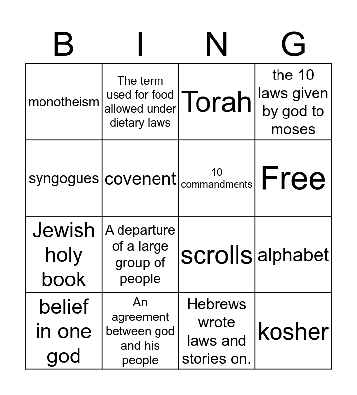 This bingo card has 16 words: An agreement between god and his people, alphabet, Torah, monotheism, Jewish holy book, The term used for food allowed under dietary laws, scrolls, Hebrews wrote laws and stories on., syngogues, covenent, belief in one god, the 10 laws given by god to moses, A departure of a large group of people, Free, 10 commandments and kosher.