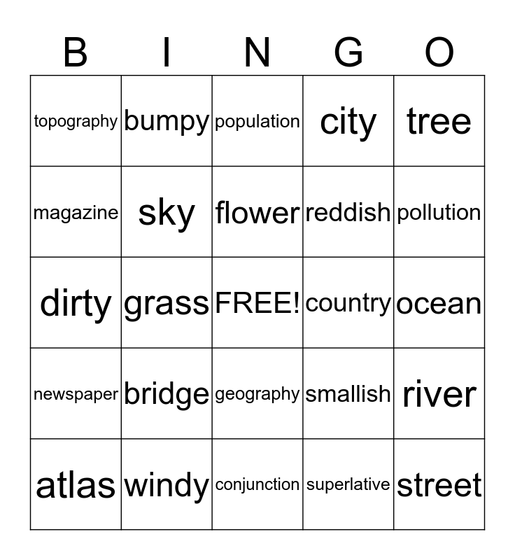 This bingo card has a free space and 37 words: barn, road, bush, sky, river, bridge, flower, globe, tree, lake, grass, city, street, ocean, magazine, newspaper, map, population, geography, country, topography, pollution, atlas, conjunction, continent, superlative, bumpy, cloudy, rocky, grassy, snowy, windy, dirty, bushy, smallish, reddish and roundish.