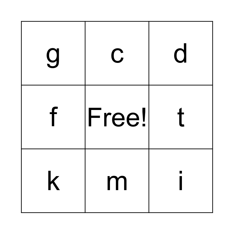 This bingo card has a free space and 8 words: t, d, c, k, g, i, f and m.