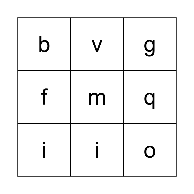 This bingo card has a free space and 12 words: l, r, o, q, v, g, i, a, b, f, i and g.