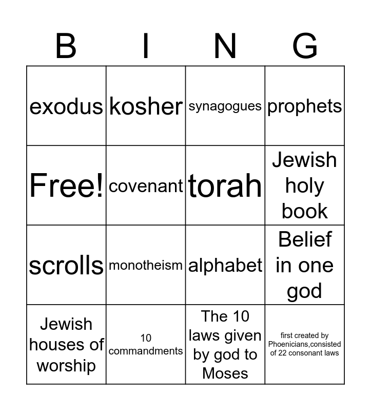 This bingo card has 16 words: 10 commandments, Belief in one god, synagogues, exodus, scrolls, kosher, alphabet, The 10 laws given by god to Moses, Free!, covenant, Jewish houses of worship, prophets, monotheism, Jewish holy book, torah and first created by Phoenicians,consisted of 22 consonant laws.