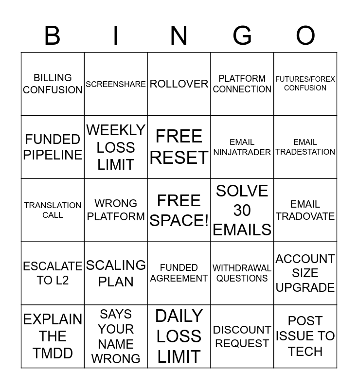 This bingo card has a free space and 24 words: SCALING PLAN, SAYS YOUR NAME WRONG, FREE RESET, EXPLAIN THE TMDD, FUTURES/FOREX CONFUSION, BILLING CONFUSION, FUNDED PIPELINE, SCREENSHARE, SOLVE 30 EMAILS, FUNDED AGREEMENT, EMAIL NINJATRADER, TRANSLATION CALL, WITHDRAWAL QUESTIONS, ACCOUNT SIZE UPGRADE, WEEKLY LOSS LIMIT, DISCOUNT REQUEST, EMAIL TRADOVATE, ROLLOVER, EMAIL TRADESTATION, WRONG PLATFORM, POST ISSUE TO TECH, ESCALATE TO L2, PLATFORM CONNECTION and DAILY LOSS LIMIT.