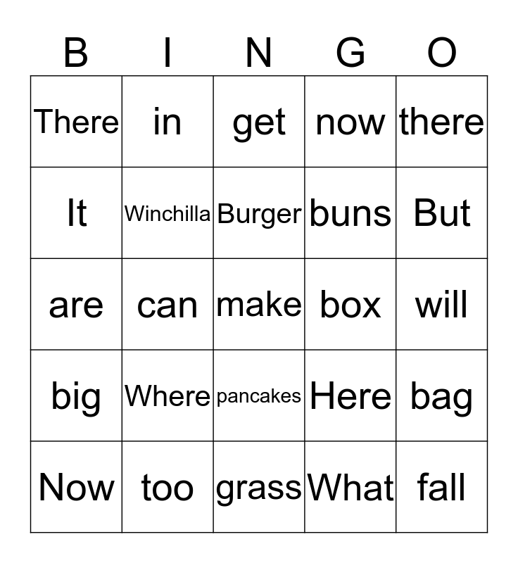 This bingo card has 25 words: Where, grass, Burger, Now, there, There, It, in, box, pancakes, buns, are, Here, bag, Winchilla, fall, will, get, But, can, make, too, big, now and What.