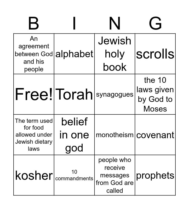 This bingo card has 16 words: 10 commandments, covenant, Jewish holy book, An agreement between God and his people, The term used for food allowed under Jewish dietary laws, alphabet, monotheism, people who receive messages from God are called, Free!, Torah, kosher, scrolls, belief in one god, the 10 laws given by God to Moses, synagogues and prophets.