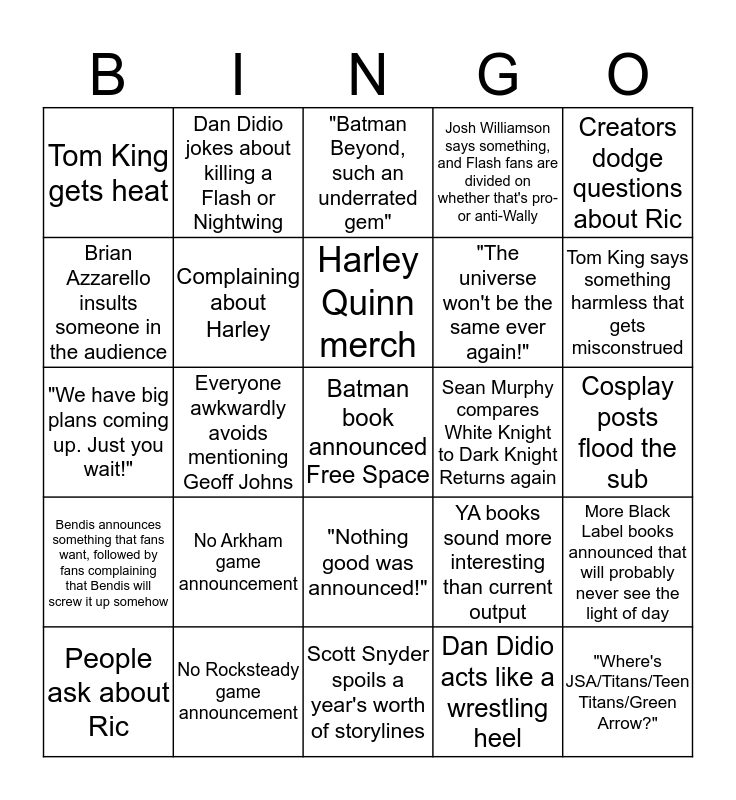 This bingo card has a free space and 24 words: No Arkham game announcement, No Rocksteady game announcement, Harley Quinn merch, People ask about Ric, Creators dodge questions about Ric, Tom King gets heat, Brian Azzarello insults someone in the audience, Dan Didio jokes about killing a Flash or Nightwing, Sean Murphy compares White Knight to Dark Knight Returns again, "Nothing good was announced!", "The universe won't be the same ever again!", "We have big plans coming up. Just you wait!", YA books sound more interesting than current output, More Black Label books announced that will probably never see the light of day, Complaining about Harley, Dan Didio acts like a wrestling heel, Cosplay posts flood the sub, "Batman Beyond, such an underrated gem", Tom King says something harmless that gets misconstrued, Everyone awkwardly avoids mentioning Geoff Johns, "Where's JSA/Titans/Teen Titans/Green Arrow?", Bendis announces something that fans want, followed by fans complaining that Bendis will screw it up somehow, Josh Williamson says something, and Flash fans are divided on whether that's pro- or anti-Wally and Scott Snyder spoils a year's worth of storylines.