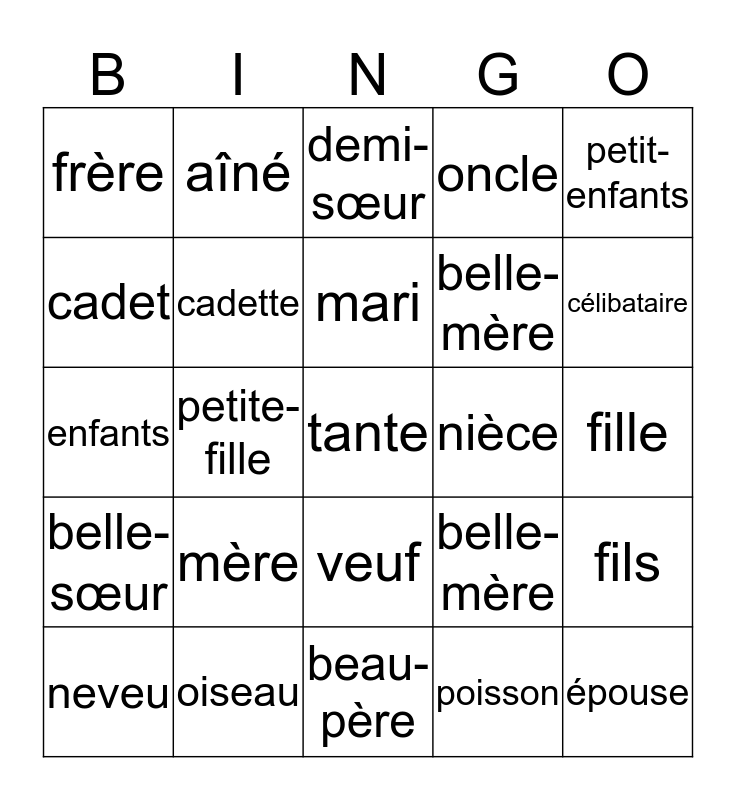 This bingo card has 25 words: mère, beau-père, mari, neveu, petit-enfants, frère, cadet, aîné, nièce, veuf, belle-mère, enfants, belle-mère, fils, cadette, épouse, fille, demi-sœur, célibataire, petite-fille, tante, oiseau, belle-sœur, oncle and poisson.