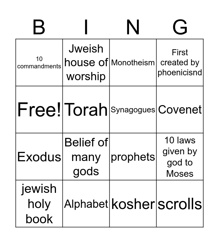 This bingo card has 16 words: Alphabet, 10 laws given by god to Moses, Monotheism, 10 commandments, Exodus, Jweish house of worship, prophets, kosher, Free!, Torah, jewish holy book, First created by phoenicisnd, Belief of many gods, Covenet, Synagogues and scrolls.