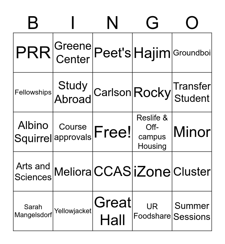 This bingo card has a free space and 34 words: Eastman Quad, UR Foodshare, Winter Share, Wilson Commons, Arts and Sciences, Study Abroad, Groundboi, Sarah Mangelsdorf, Greene Center, Rush Rhees, Carlson, Peet's, Humanities Center, Dandelion, Reslife & Off-campus Housing, Transfer Student, Yellowjacket, Albino Squirrel, Meliora, iZone, CCAS, Quad Fox, PRR, Minor, Great Hall, Summer Sessions, Hajim, Food Pantry, Rocky, Fellowships, Major, Course approvals, Cluster and CETL.