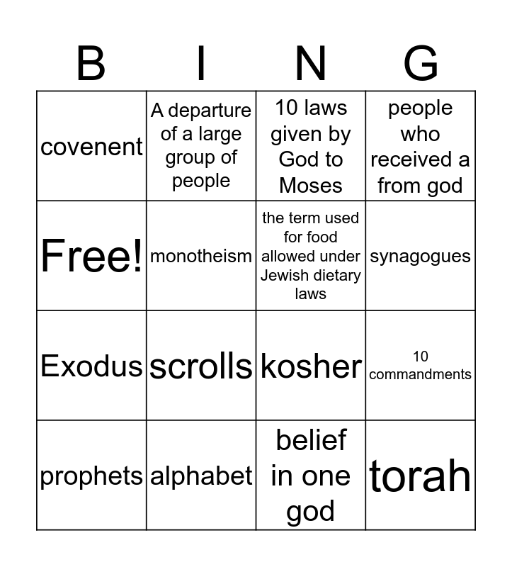 This bingo card has 16 words: alphabet, 10 commandments, 10 laws given by God to Moses, covenent, Exodus, A departure of a large group of people, kosher, belief in one god, Free!, monotheism, prophets, people who received a from god, scrolls, synagogues, the term used for food allowed under Jewish dietary laws and torah.