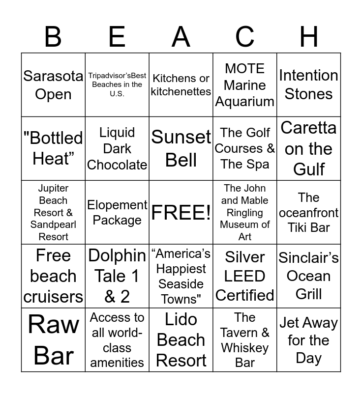 This bingo card has a free space and 24 words: Dolphin Tale 1 & 2, Access to all world-class amenities, Sunset Bell, Raw Bar, Intention Stones, Sarasota Open, "Bottled Heat”, Tripadvisor’sBest Beaches in the U.S., The John and Mable Ringling Museum of Art, “America’s Happiest Seaside Towns", The Golf Courses & The Spa, Jupiter Beach Resort & Sandpearl Resort, Silver LEED Certified, Sinclair’s Ocean Grill, Liquid Dark Chocolate, The Tavern & Whiskey Bar, The oceanfront Tiki Bar, Kitchens or kitchenettes, Caretta on the Gulf, Elopement Package, Jet Away for the Day, Free beach cruisers, MOTE Marine Aquarium and Lido Beach Resort.