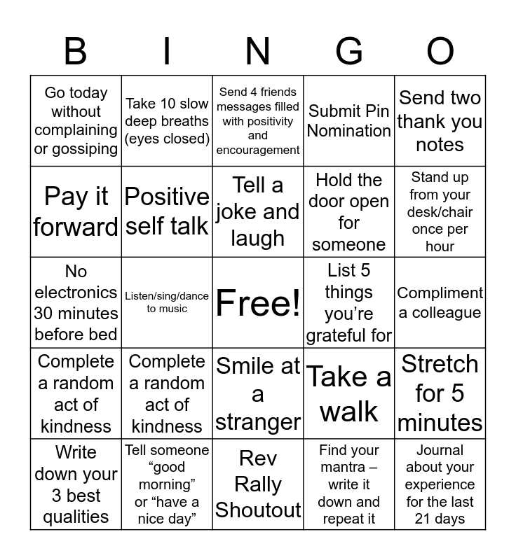 This bingo card has a free space and 24 words: Complete a random act of kindness, Tell someone “good morning” or “have a nice day”, Tell a joke and laugh, Write down your 3 best qualities, Send two thank you notes, Go today without complaining or gossiping, Pay it forward, Take 10 slow deep breaths (eyes closed), List 5 things you’re grateful for, Smile at a stranger, Hold the door open for someone, No electronics 30 minutes before bed, Take a walk, Stretch for 5 minutes, Positive self talk, Find your mantra – write it down and repeat it, Compliment a colleague, Send 4 friends messages filled with positivity and encouragement, Stand up from your desk/chair once per hour, Listen/sing/dance to music, Journal about your experience for the last 21 days, Complete a random act of kindness, Submit Pin Nomination and Rev Rally Shoutout.