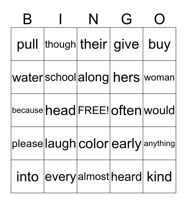 This bingo card has a free space and 24 words: laugh, every, along, into, buy, pull, water, though, often, color, hers, because, early, anything, school, heard, would, their, woman, head, kind, please, give and almost.