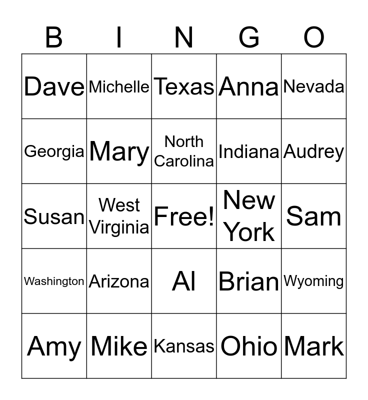 This bingo card has a free space and 24 words: Arizona, Mike, North Carolina, Amy, Nevada, Dave, Georgia, Michelle, New York, Al, Indiana, Susan, Brian, Wyoming, Mary, Ohio, Sam, Texas, Audrey, West Virginia, Mark, Washington, Anna and Kansas.