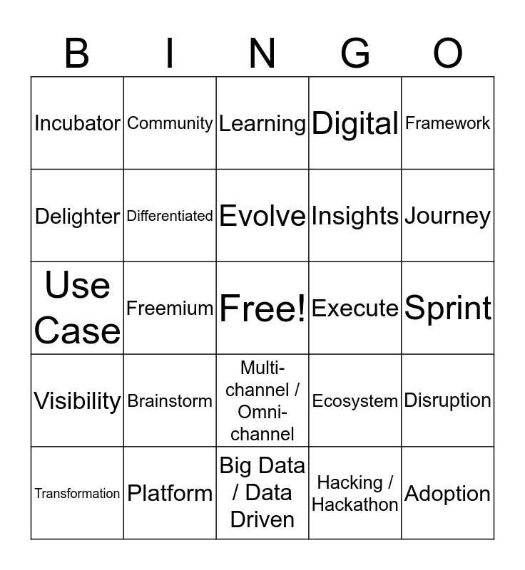 This bingo card has a free space and 50 words: (X/Anything) Lift, Adoption, Agile, Big Data / Data Driven, Brainstorm, Collaboration, Community, Customer, Delighter, Design, Differentiated, Digital, Disruption, Ecosystem, Emerging, Entrepreneur / Intrepreneur, Evolve, Execute, Fail fast, Framework, Freemium, Hacking / Hackathon, Incubator, Insights, Integration, Iterate, Journey, Lean, Learning, Multi-channel / Omni-channel, Offering, Pilot, Pivot, Platform, Platform, Pricing, Profitability, Scale, Solve for (X/anything), Sprint, Startup, Sustainable, Systematize, Testing, Transformation, Use Case, Validate, Value Add / Value Prop, Visibility and Wireframe.