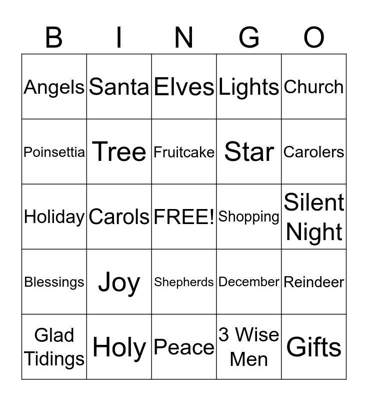 This bingo card has a free space and 49 words: Holly, Gifts, Love, Peace, Joy, Candy Cane, Santa, Mistletoe, Poinsettia, Chimney, Tree, Lights, Reindeer, December, Family, Christmas Cards, Fruitcake, Shopping, Presents, Church, Carols, 3 Wise Men, Angels, Star, Manger, Carolers, Glad Tidings, Nativity, Shepherds, Blessings, Jesus, God, Heaven, Decorations, Holy, Cheer, Ho Ho Ho, Noel, Silent Night, Yuletide, Wrapping Paper, Partridge, Cookies, Bells, Holiday, Elves, Jingle Bells, Nutcracker and Stockings.