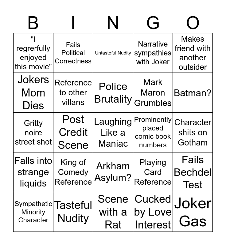 This bingo card has a free space and 24 words: King of Comedy Reference, Tasteful Nudity, Police Brutality, Sympathetic Minority Character, Makes friend with another outsider, "I regrerfully enjoyed this movie", Jokers Mom Dies, Fails Political Correctness, Prominently placed comic book numbers, Arkham Asylum?, Mark Maron Grumbles, Gritty noire street shot, Playing Card Reference, Fails Bechdel Test, Reference to other villans, Cucked by Love Interest, Character shits on Gotham, Untasteful.Nudity, Batman?, Post Credit Scene, Joker Gas, Falls into strange liquids, Narrative sympathies with Joker and Scene with a Rat.