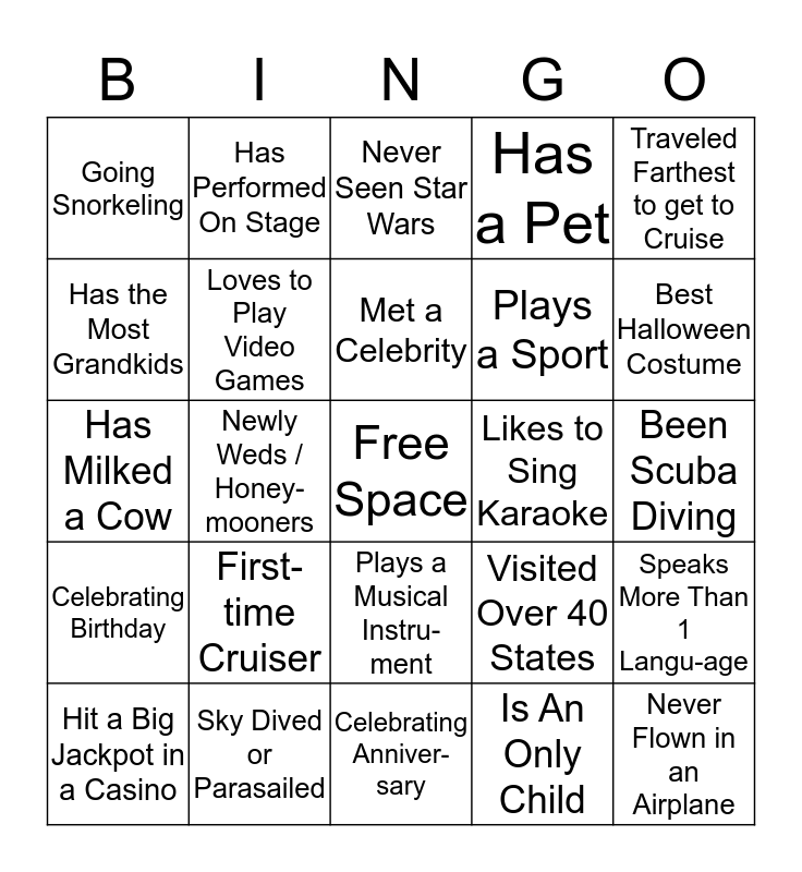 This bingo card has a free space and 24 words: First-time Cruiser, Sky Dived or Parasailed, Met a Celebrity, Hit a Big Jackpot in a Casino, Traveled Farthest to get to Cruise, Going Snorkeling, Has the Most Grandkids, Has Performed On Stage, Likes to Sing Karaoke, Plays a Musical Instru-ment, Plays a Sport, Has Milked a Cow, Visited Over 40 States, Speaks More Than 1 Langu-age, Loves to Play Video Games, Is An Only Child, Been Scuba Diving, Never Seen Star Wars, Best Halloween Costume, Newly Weds / Honey-mooners, Never Flown in an Airplane, Celebrating Birthday, Has a Pet and Celebrating Anniver-sary.