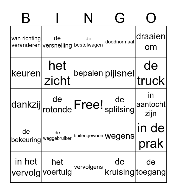 This bingo card has a free space and 35 words: de zintuigen, de reuk, de tastzin, het zicht, buitengewoon, doodnormaal, keuren, het gerecht, bepalen, bitter, dankzij, draaien om, de verkeersregels, het verbod, van richting veranderen, de splitsing, de kruising, de rotonde, de bekeuring, de toegang, wegens, in het vervolg, in de prak, het voertuig, de bestelwagen, de truck, de koets, stapvoets, pijlsnel, in aantocht zijn, echter, vervolgens, de weggebruiker, de versnelling and belanden.