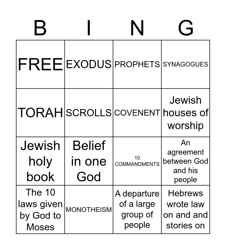 This bingo card has 16 words: MONOTHEISM, An agreement between God and his people, PROPHETS, FREE, Jewish holy book, EXODUS, 10 COMMANDMENTS, A departure of a large group of people, TORAH, SCROLLS, The 10 laws given by God to Moses, SYNAGOGUES, Belief in one God, Jewish houses of worship, COVENENT and Hebrews wrote law on and and stories on.