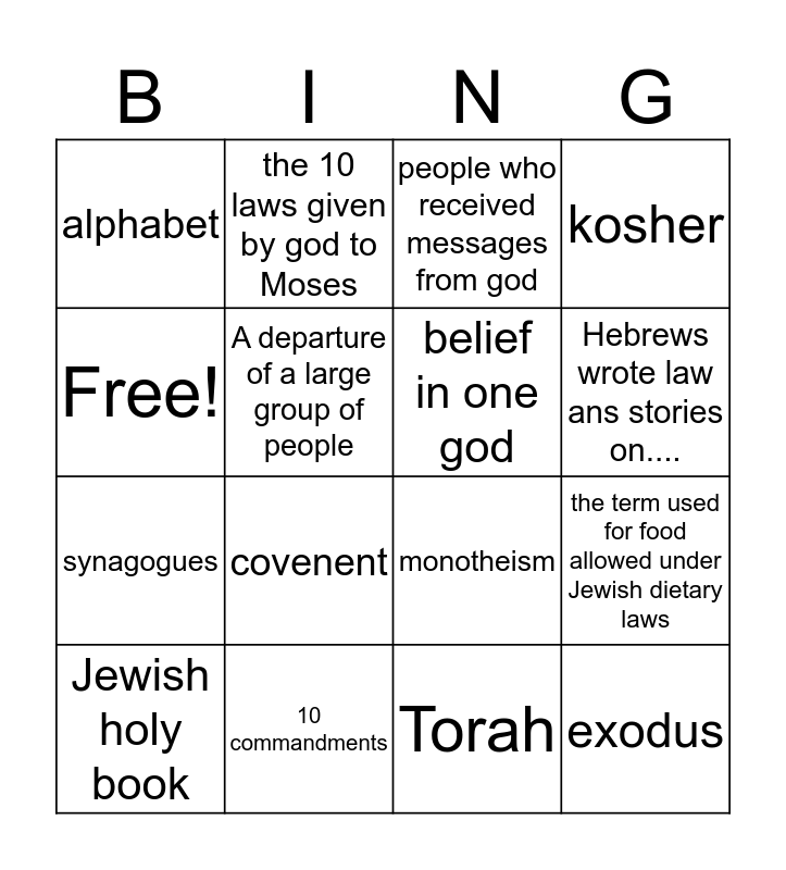 This bingo card has 16 words: 10 commandments, the term used for food allowed under Jewish dietary laws, people who received messages from god, alphabet, synagogues, the 10 laws given by god to Moses, monotheism, Torah, Free!, A departure of a large group of people, Jewish holy book, kosher, covenent, Hebrews wrote law ans stories on...., belief in one god and exodus.