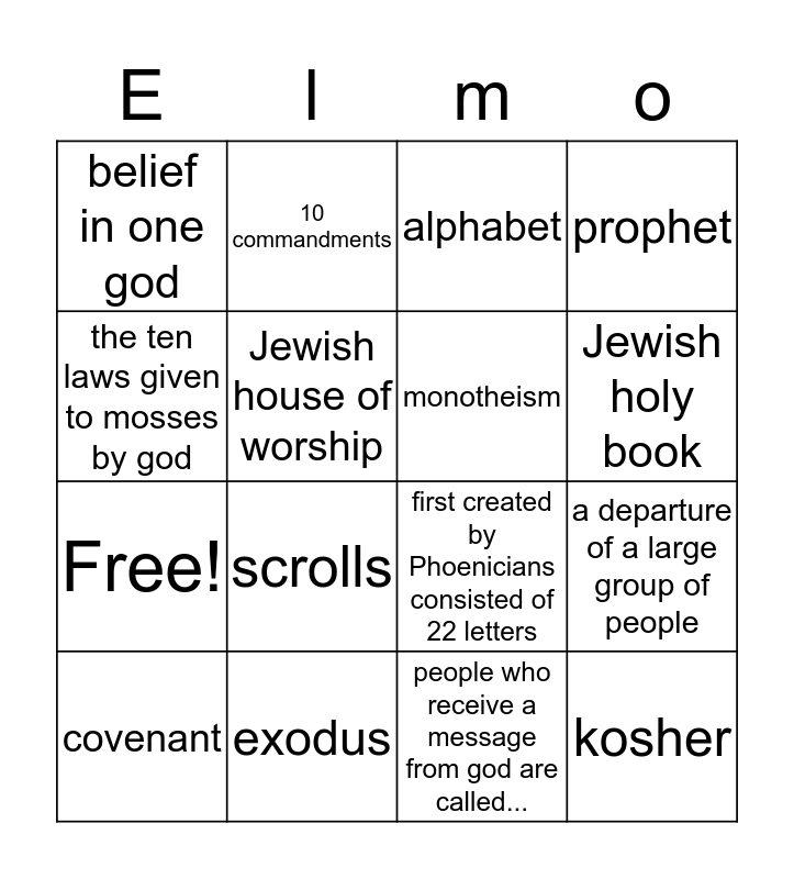 This bingo card has 20 words: a departure of a large group of people, the term for food allowed, alphabet, Hebrews wrote law and story on, covenant, the ten laws given to mosses by god, exodus, belief in one god, Free!, 10 commandments, scrolls, first created by Phoenicians consisted of 22 letters, Jewish house of worship, kosher, monotheism, Torah, Jewish holy book, prophet, people who receive a message from god are called... and synagogues.