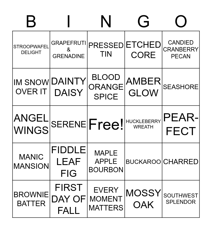 This bingo card has a free space and 24 words: FIDDLE LEAF FIG, FIRST DAY OF FALL, BLOOD ORANGE SPICE, BROWNIE BATTER, CANDIED CRANBERRY PECAN, STROOPWAFEL DELIGHT, IM SNOW OVER IT, GRAPEFRUTI & GRENADINE, HUCKLEBERRY WREATH, MAPLE APPLE BOURBON, AMBER GLOW, ANGEL WINGS, BUCKAROO, CHARRED, DAINTY DAISY, MOSSY OAK, PEAR-FECT, PRESSED TIN, SEASHORE, SERENE, SOUTHWEST SPLENDOR, MANIC MANSION, ETCHED CORE and EVERY MOMENT MATTERS.