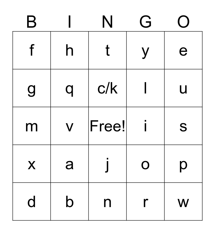 This bingo card has a free space and 24 words: a, b, c/k, d, e, f, g, h, i, j, l, m, o, p, q, r, s, t, u, v, w, x, y and n.