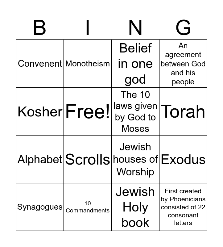 This bingo card has 16 words: 10 Commandments, Exodus, Belief in one god, Convenent, Alphabet, Monotheism, Jewish houses of Worship, Jewish Holy book, Kosher, Free!, Synagogues, An agreement between God and his people, Scrolls, Torah, The 10 laws given by God to Moses and First created by Phoenicians consisted of 22 consonant letters.