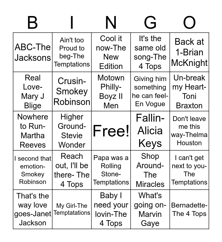 This bingo card has a free space and 26 words: Papa was a Rolling Stone-Temptations, What's going on-Marvin Gaye, Motown Philly-Boyz II Men, My Girl-The Temptatations, Back at 1-Brian McKnight, ABC-The Jacksons, Real Love-Mary J Blige, Ain't too Proud to beg-The Temptations, Don't leave me this way-Thelma Houston, Shop Around-The Miracles, Giving him something he can feel-En Vogue, Nowhere to Run-Martha Reeves, I can't get next to you-The Temptations, That's the way love goes-Janet Jackson, Higher Ground-Stevie Wonder, Treat her like a Lady-The Temptations, It's the same old song-The 4 Tops, I second that emotion-Smokey Robinson, Cool it now-The New Edition, Bernadette-The 4 Tops, Un-break my Heart-Toni Braxton, Baby I need your lovin-The 4 Tops, Fallin-Alicia Keys, Reach out, I'll be there- The 4 Tops, Crusin-Smokey Robinson and We Belong together-Mariah Carey.