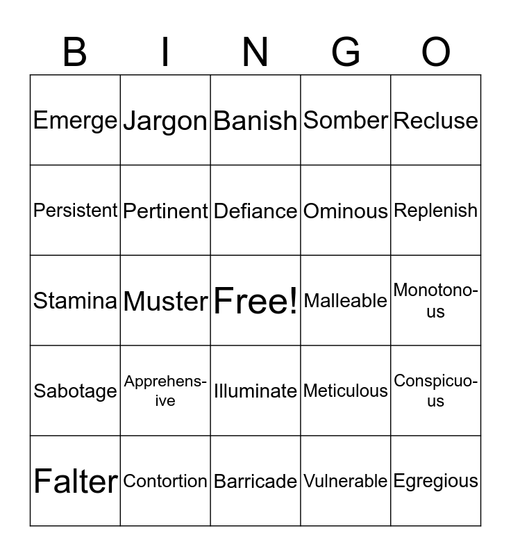 This bingo card has a free space and 24 words: Apprehens-ive, Contortion, Defiance, Falter, Recluse, Emerge, Persistent, Jargon, Malleable, Illuminate, Ominous, Stamina, Meticulous, Conspicuo-us, Pertinent, Vulnerable, Monotono-us, Banish, Replenish, Muster, Egregious, Sabotage, Somber and Barricade.